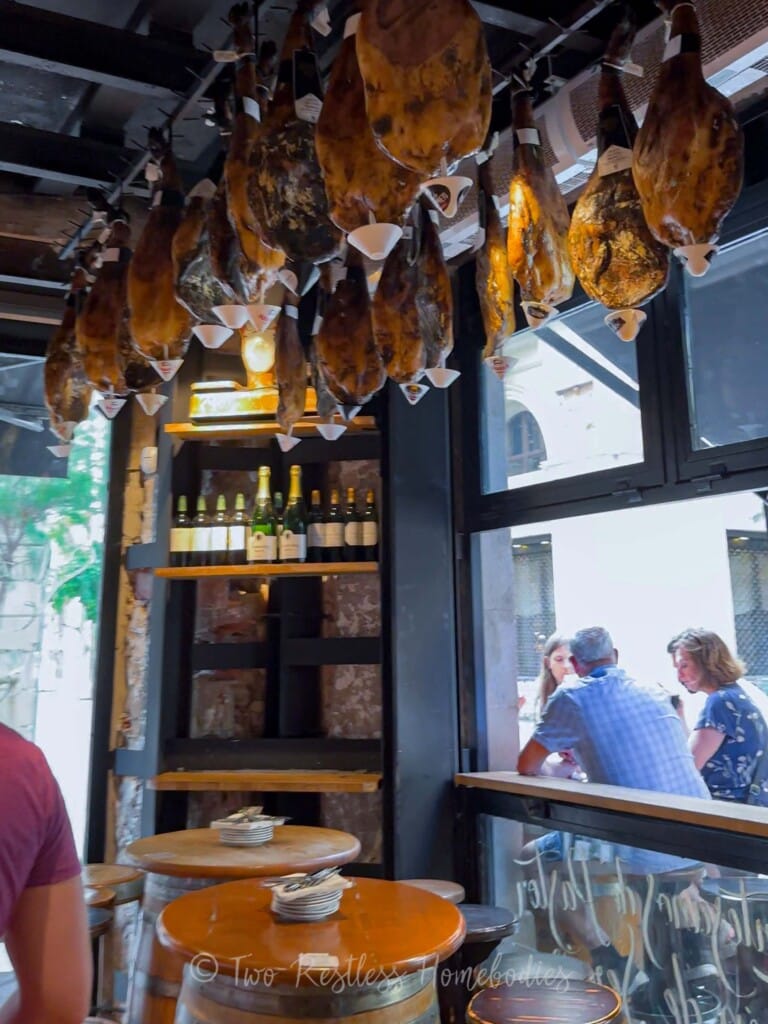 If you want to live like a local, roll up to a cafe or bar for dinner around 9pm, order a couple of drinks, and some jamón and pan con tomate. Or, grab some pan con tomate for your late afternoon snack. Or… if you’re us… do both! 😂 It is the quintessential merienda (late afternoon snack) item, and probably top of the list of comida tipica catalana.
